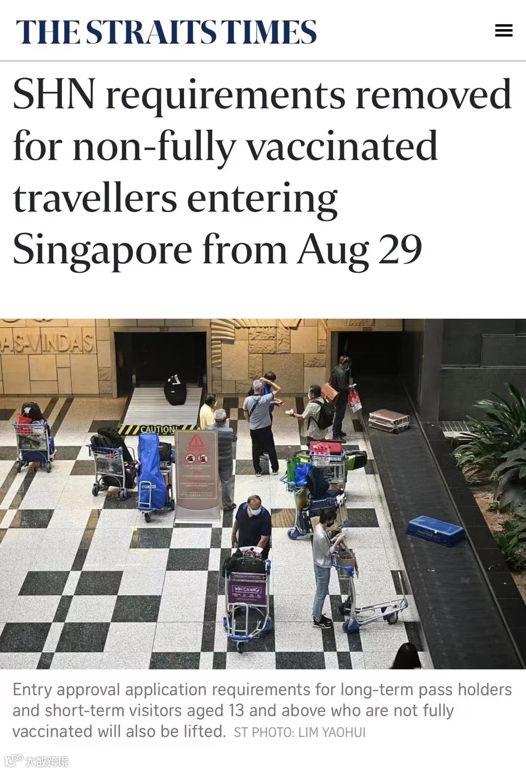 这个星期天(8 月 28 日)深夜 11 时 59 分起,所有入境新加坡的旅客即使没有完成冠病疫苗接种,只要在行前两天内取得阴性核酸检测(PCR)证明,抵境后不再需要履行七天居家通知。