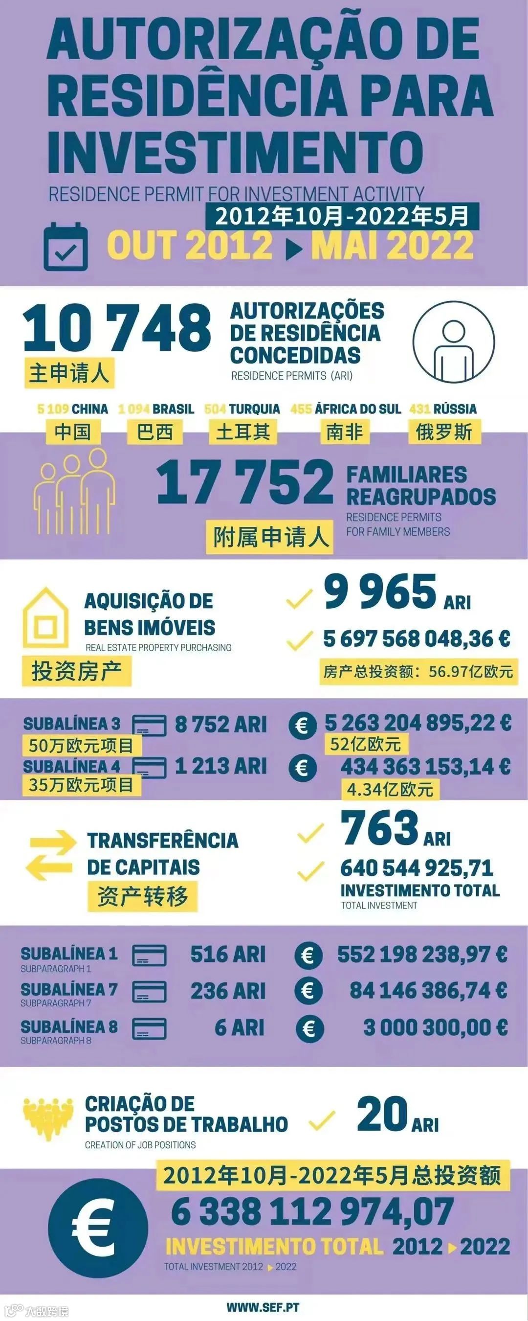 葡萄牙移民局也再次更新了2012年10月黄金居留政策推行以来的整体数据,数据显示,10年来,已有10748位主申请人获批葡萄牙黄金签证,其中中国申请人为5109人,占比在一半以上,可见中国投资者对葡萄牙项目的喜爱和认可。通过黄金签证计划,葡萄牙共吸纳了63.38亿欧元投资,其中56.97亿资金直接投资于房地产市场。