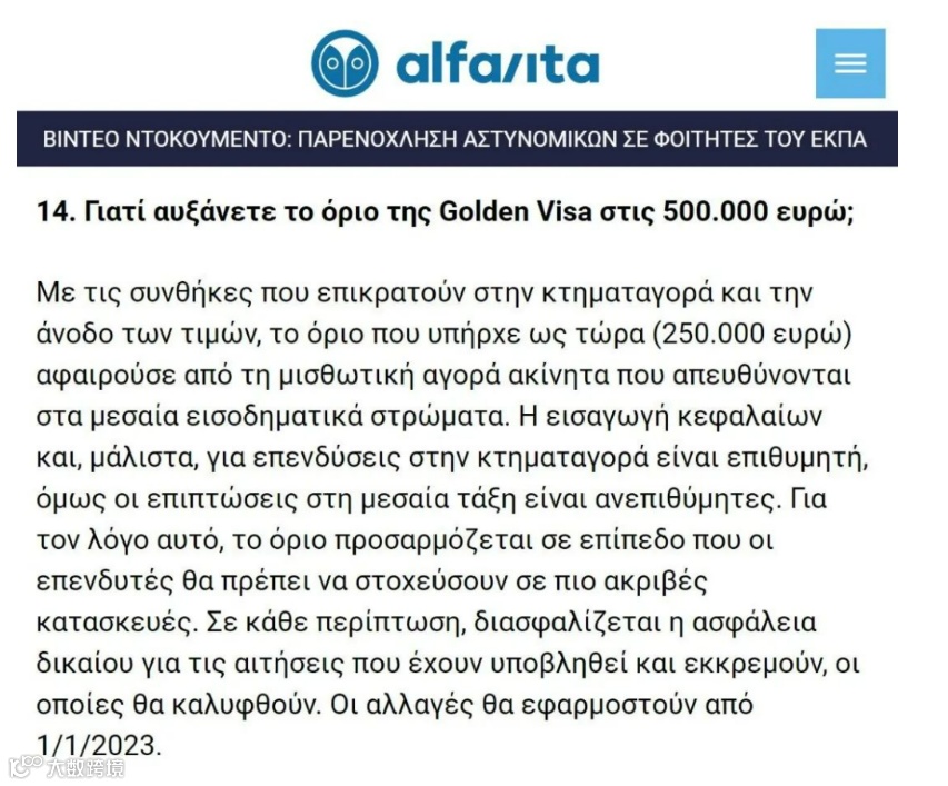 定了!希腊黄金签证将于2023年1月1日起正式涨价至50万欧元