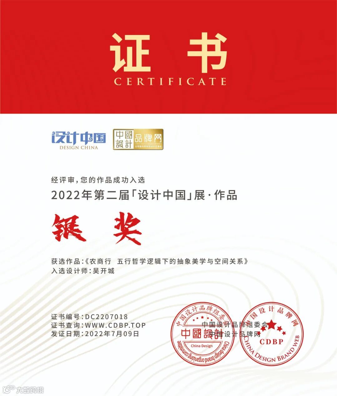 近日,2022年第二届「设计中国」展·作品揭晓获奖名单,开城设计作品《农商行 五行哲学逻辑下的抽象美学与空间关系》从众多参赛作品中脱颖而出,斩获银奖!