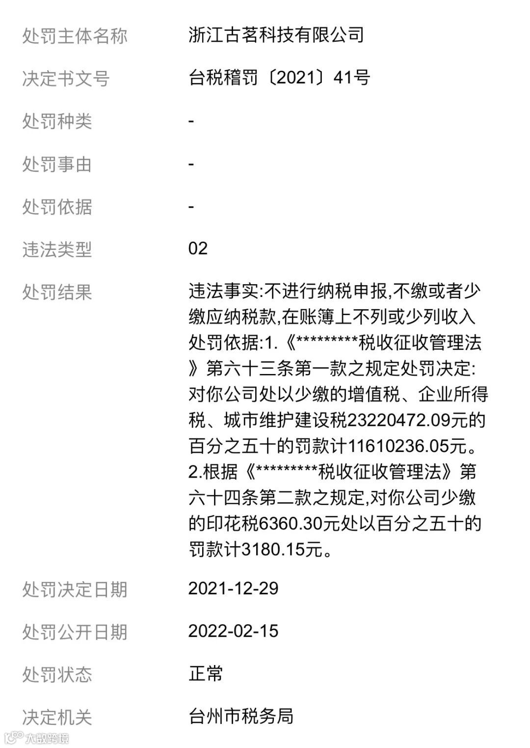 近期,古茗奶茶关联公司浙江古茗科技有限公司被台州市税务局罚款1161万余元。