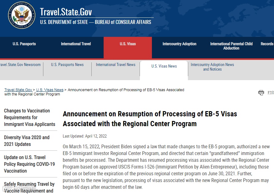 好消息!美国国务院于4月12日宣布,恢复与区域中心计划相关的EB-5签证的处理。并指示那些符合“祖父法则”之投资人享有其移民福利。该部门已恢复根据批准的USCIS I-526表格处理与区域中心计划相关的签证,包括在之前的区域中心计划于2021年6月30日到期或之前提交的签证。