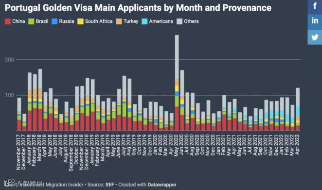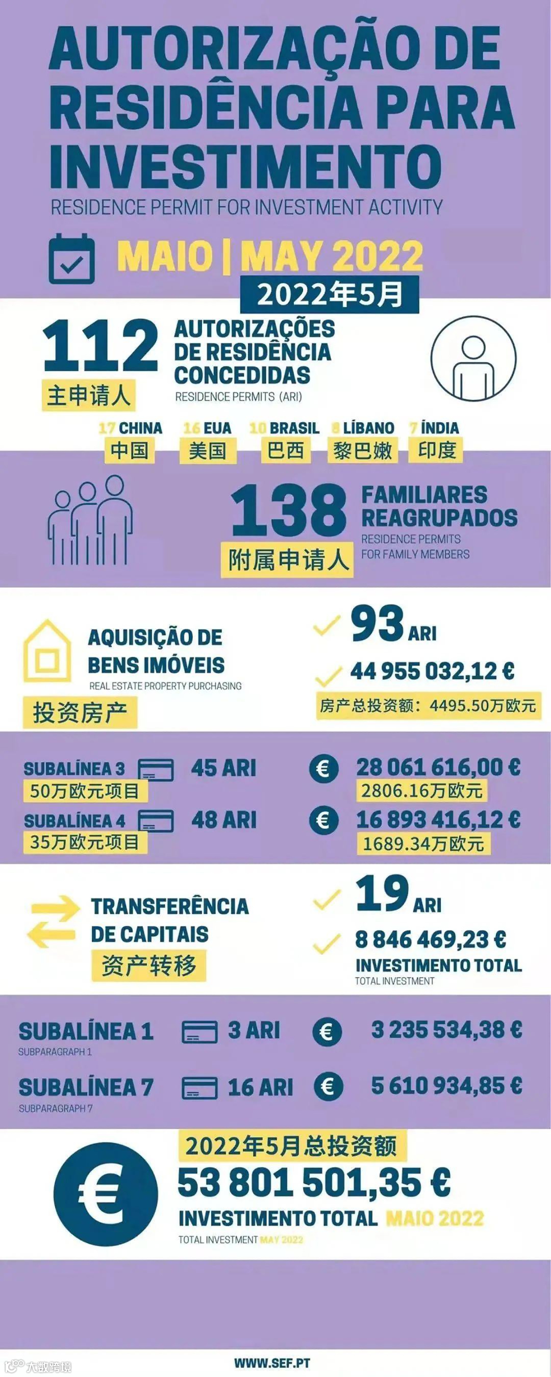 近日,葡萄牙移民局(SEF)公布了2022年5月的黄金居留签证申请数据,5月的申请总数为112人,附属申请人为138人,获批总人数为250人,总投资额5380万欧元。