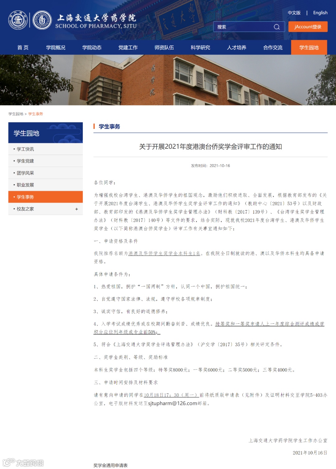 上海交通大学发布的关于2021年港澳台及华侨学生奖学金评审工作的通知