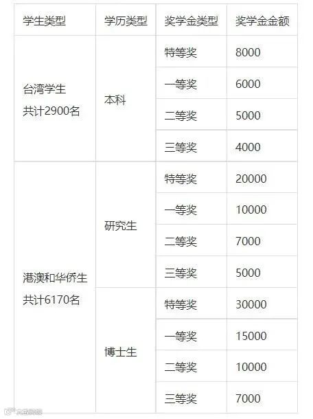 根据财政部和教育部2017年下发的《港澳及华侨学生奖学金管理办法》 的相关规定,为欢迎更多的香港、澳门、台湾地区学生和华侨学生来内地(祖国大陆)学习,针对他们设立专门的奖学金,名额总计9070名,获奖学生比例不低于30%。