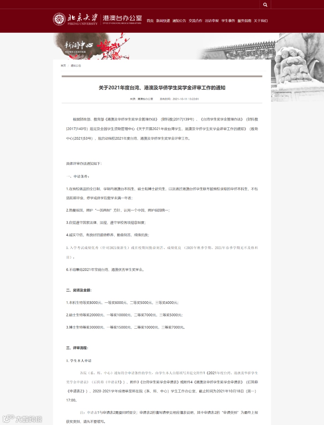 下图为北京大学2021年发布的关于港澳台及华侨学生奖学金评审工作的通知、申请条件、奖项及金额和评审流程