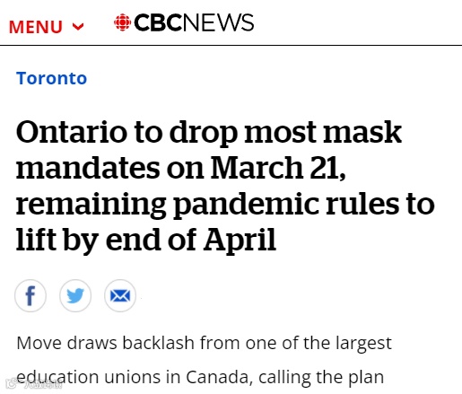 从3月21日开始,加拿大人口最多的省份,安大略省也将“举省摘口罩”——戴口罩从强制转为建议。