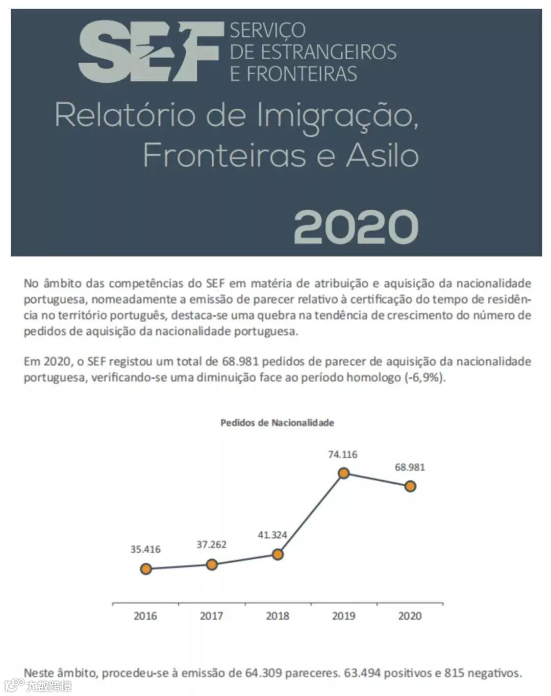 据葡萄牙外国人和边境服务局(SEF)最新《移民、边境和庇护报告》显示,2020年,在68981个葡萄牙国籍申请中,有63494人申请成功,成功率高达92%!
