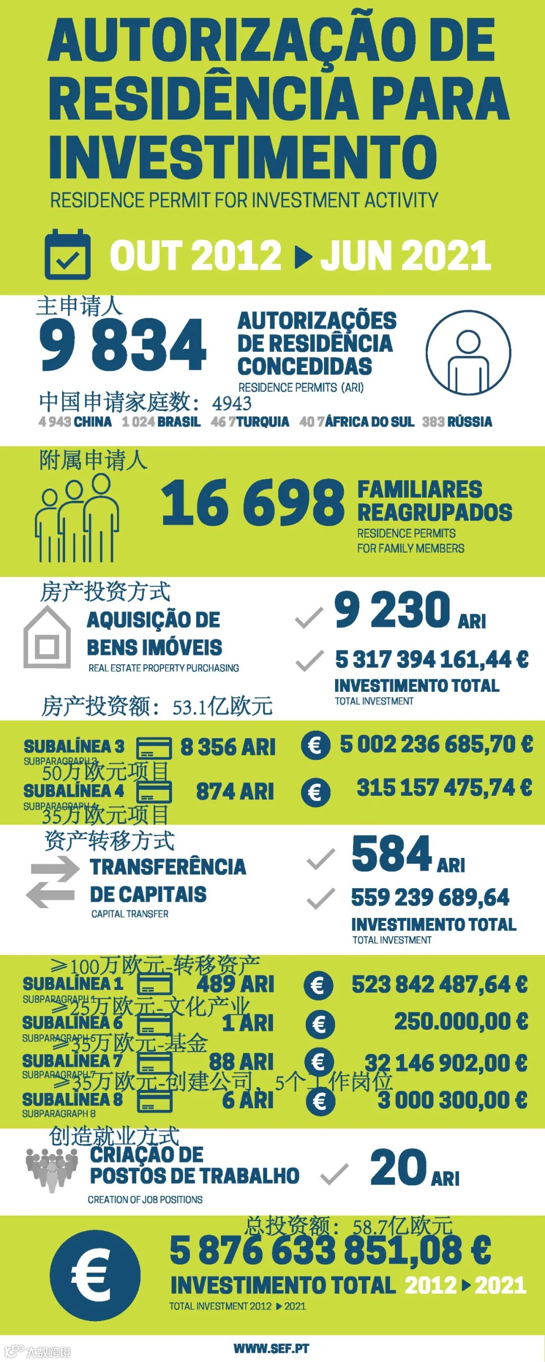 2021年根据葡萄牙移民局公布的黄金签证数据,葡萄牙移民热度依旧不减,葡萄牙自于2012年10月8日黄金居留许可政策开放,到今年已经步入第9个年头。截至2021年6月,葡萄牙黄金签证共签发9834位主申请人,总投资额高达58.7亿欧元。