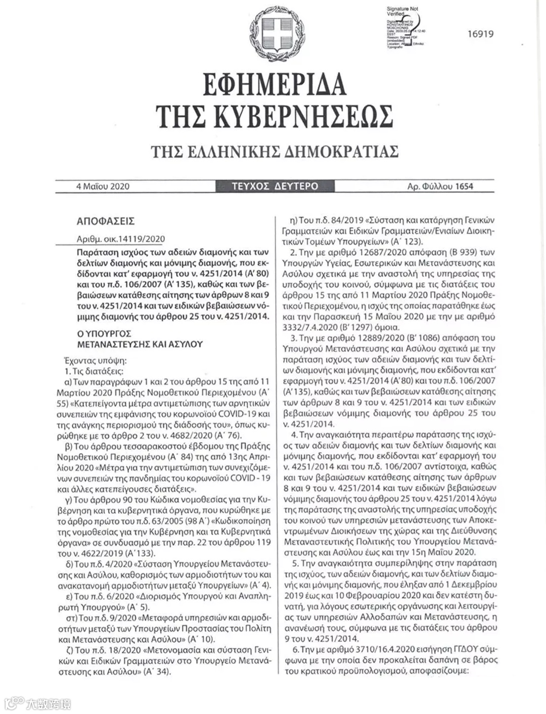 由于受新冠疫情影响以及移民局的对外暂停办公,根据联合部长级决定,希腊移民和庇护部对于到期的居留和签证时间期限再次进行延长。