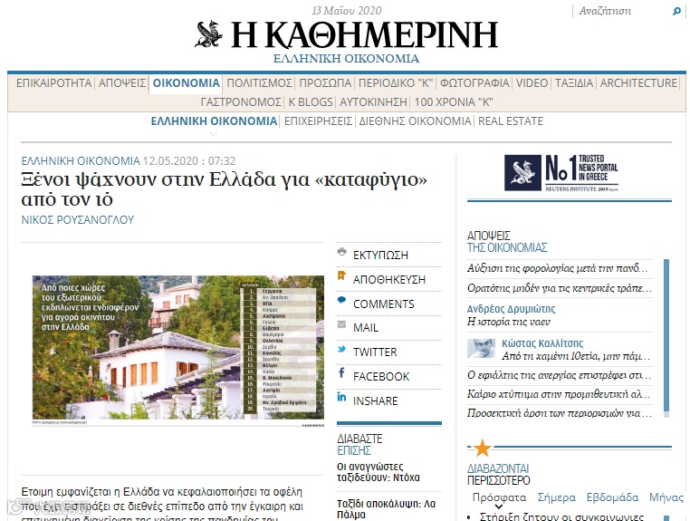 据希腊知名房地产网站Spitogatos向《每日报》提供的数据,今年4月,外国潜在买家的希腊房产搜索率增加了19.3%,并不像人们预料的那样由于疫情而消退。到4月底,这一增幅进一步扩大,达到了30%。