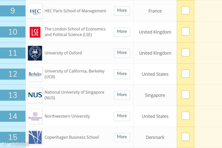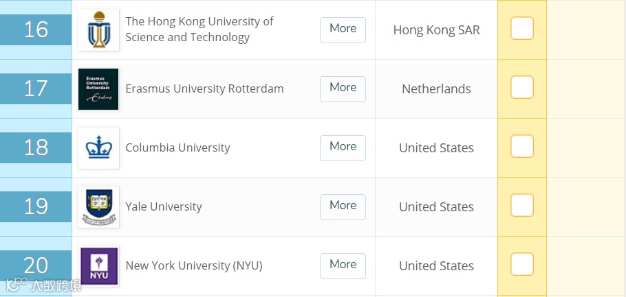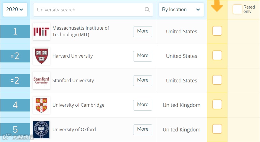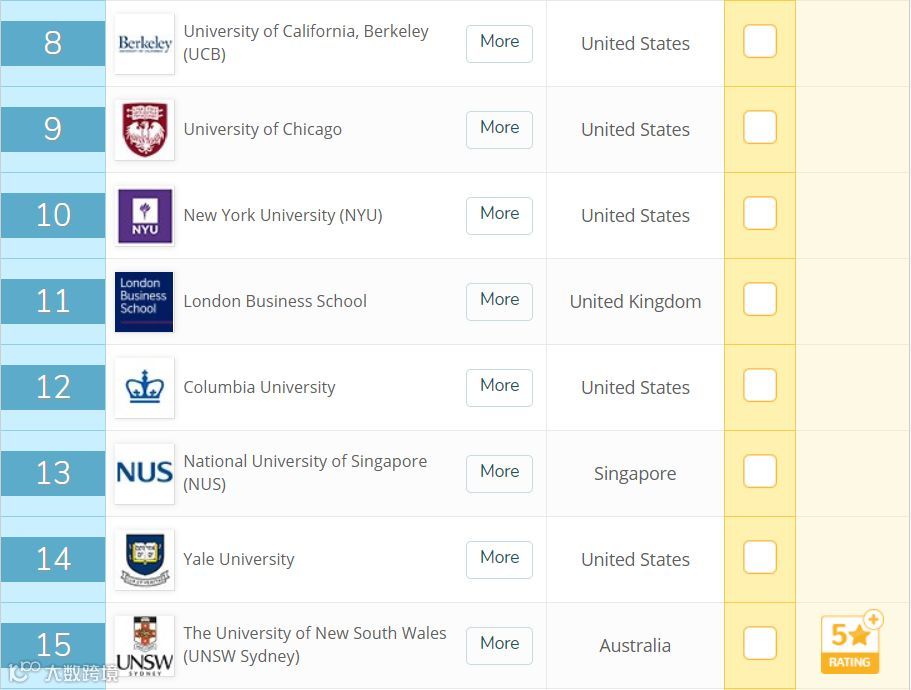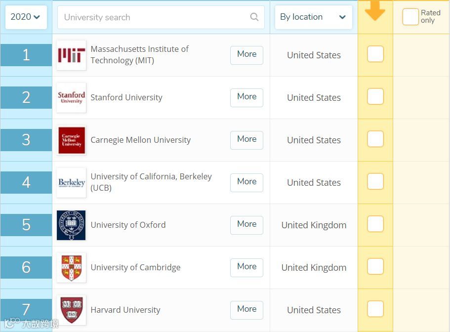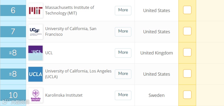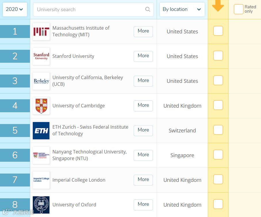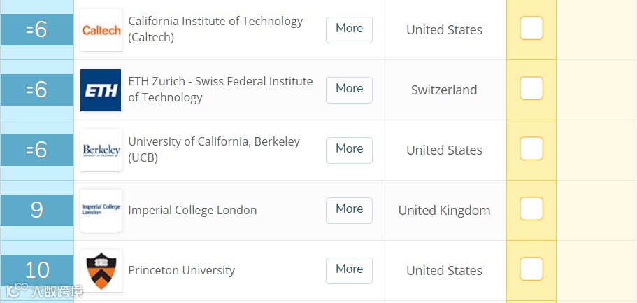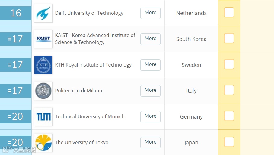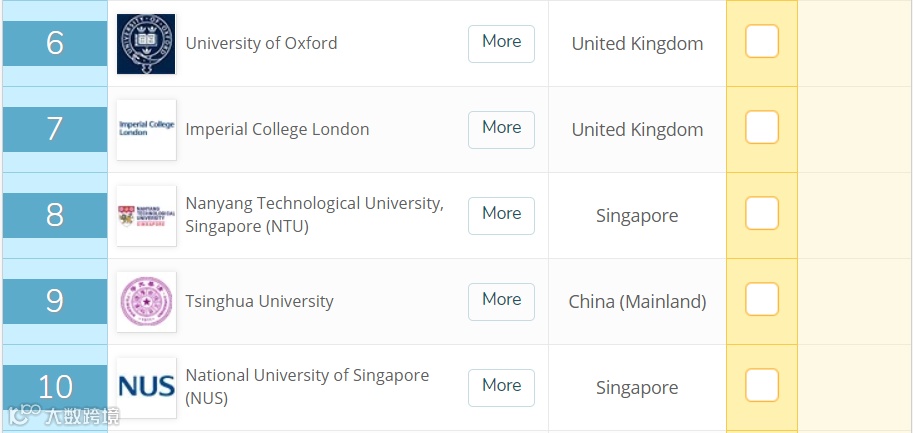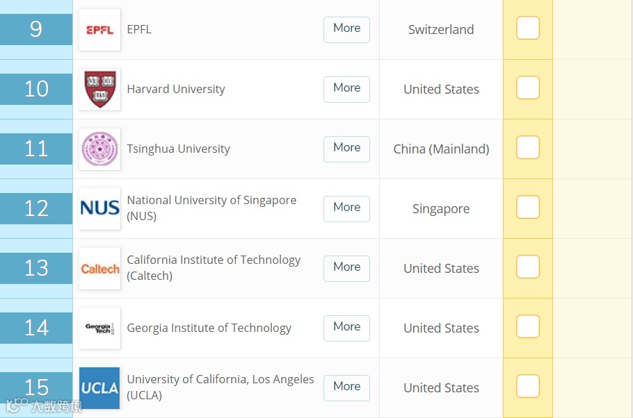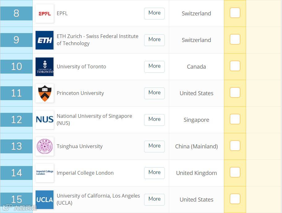 我们可以看到,这五个领域的前十名基本上都是由美国大学占领,在工程技术领域中,清华大学表现也亮眼,进入了世界前十。