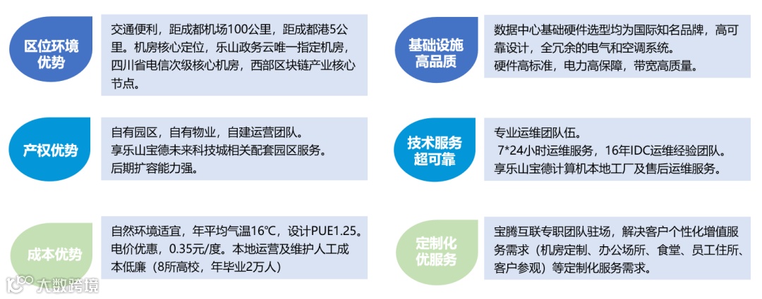 、四川乐山三座高等级数据中心,并以此为原点,规划了广深南部中心、四川西部中心、湖北中部中心、京津冀北部中心、江浙沪东部中心,并向周边辐射,愿景是在全国范围内向客户提供优质IDC资源。数据中心按照T3+标准建设,已通过国家A级机房认证,ISO27001、ISO20000、ISO9001国际认证。