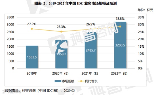 中国IDC圈数据显示,2019年,中国数据中心业务市场规模达到1562.5亿元,同比增长27.2%。