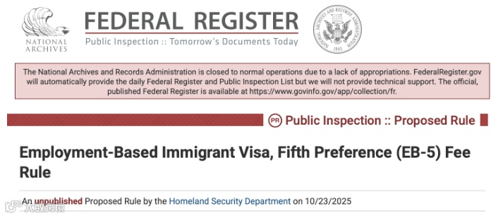2025年10月23日,美国国土安全部在《联邦公报》正式发布《Employment-Based Immigrant Visa, Fifth Preference (EB-5) Fee Rule》拟议规则,进入为期60天的公众意见征集期(截止至2025年12月22日)。