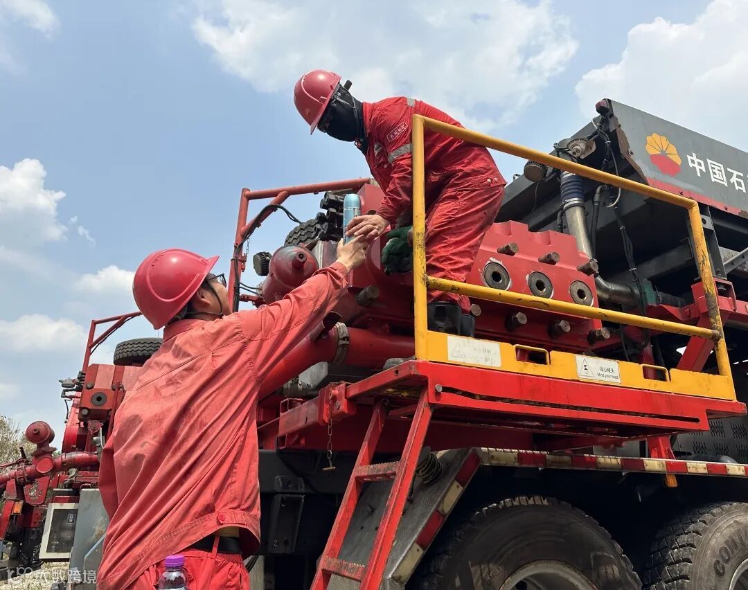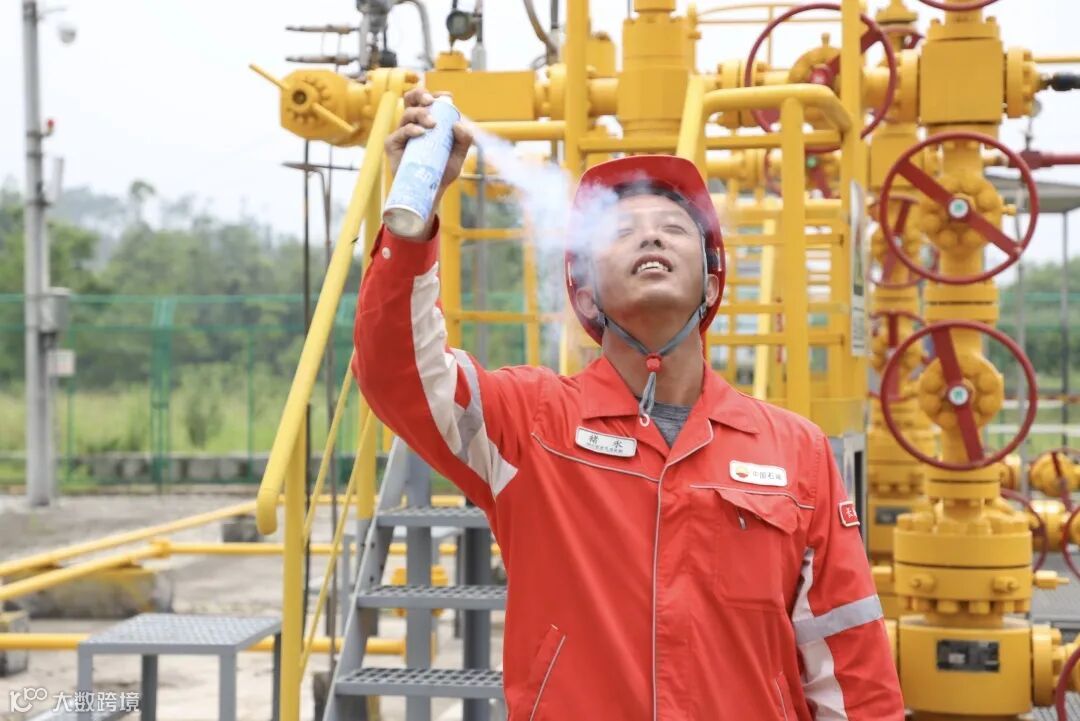 “喷一喷,瞬间清凉了许多。”7月1日,在威202H6平台增压设备管线连接现场,四川页岩气项目部威远作业区气井管理队员正拿着降温喷雾缓解暑热。