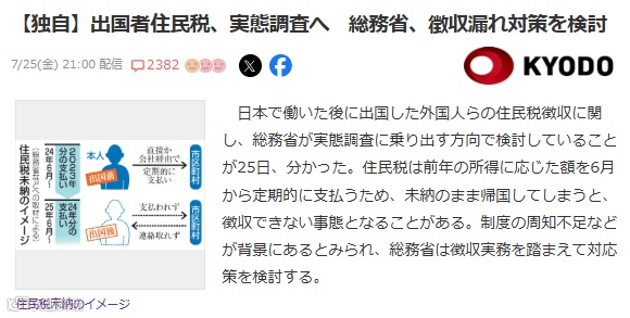 7月25日,日本总务省发布通知称,将对曾在日本工作后出国的外国人可能存在的住民税漏缴问题展开全面调查,并着手制定应对策略。