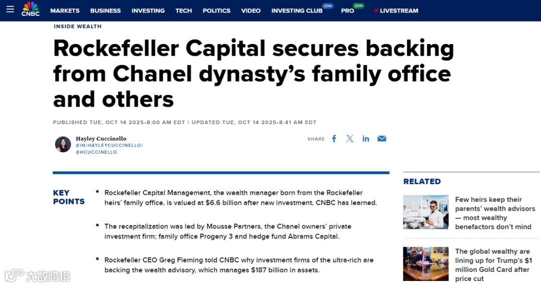近日,洛克菲勒家族办公室发展而来的财富管理机构——洛克菲勒资本管理公司,在完成新一轮融资后估值已达66亿美元,成为全球财富管理领域备受关注的交易。