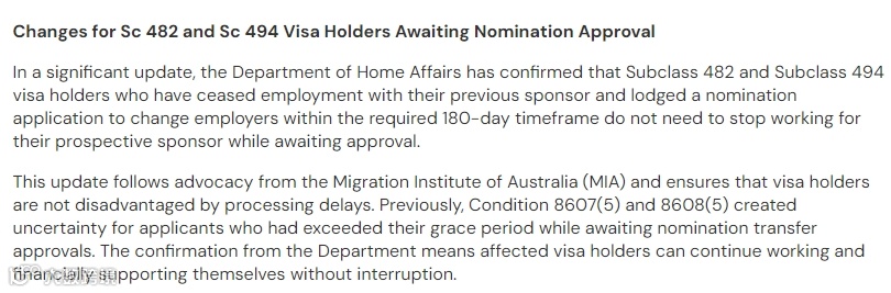 据澳洲移民局确定消息,482和494签证持有者更换雇主后,即便新提名在180天内尚未获批,也能继续为新雇主工作,不再因审批延迟面临不利影响。