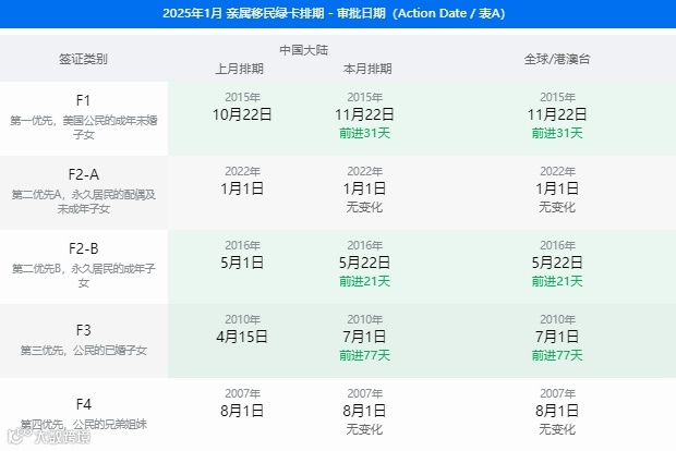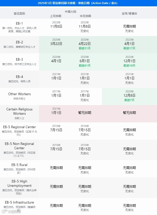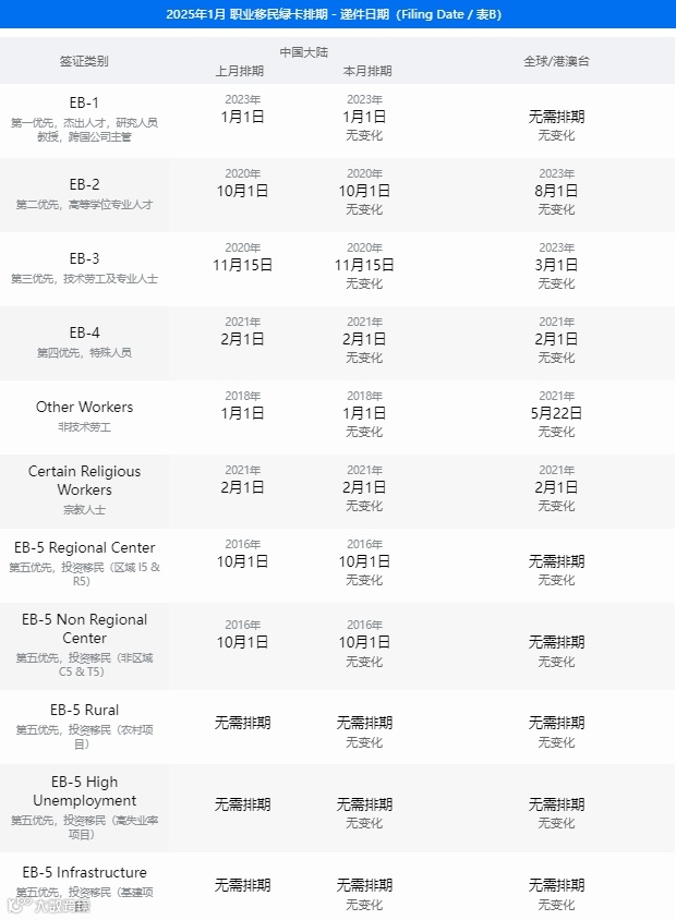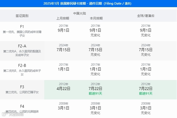 美国国务院签证办公室公布了2025年1月的签证公告(Visa Bulletin),关于职业移民和亲属移民排期表详情见以下表格。