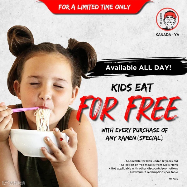 在Marina Square, Paragon & Jem分店,每点一份特制拉面,12岁及以下的宝贝就可以免费获得一份儿童餐,有儿童尺寸的拉面、盖饭或拼盘可选!
