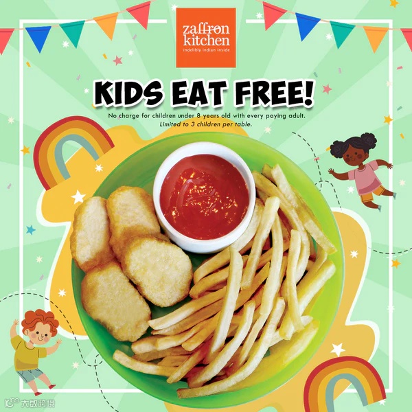 印度菜,香喷喷的多种美味!每位成人消费,随行的8岁以下儿童可享免费餐点,包括鸡块或炸鱼薯条。
