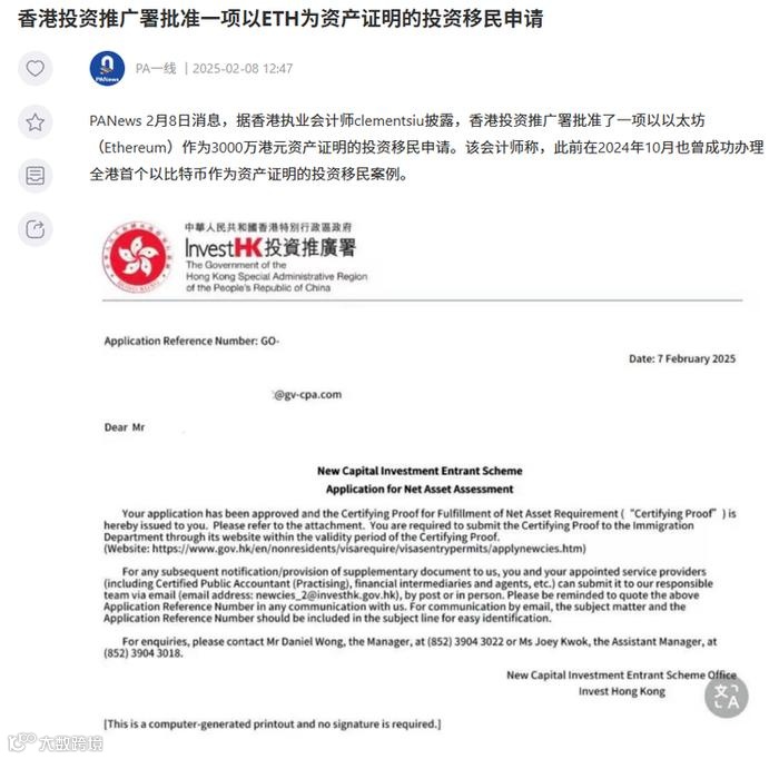 根据香港媒体报道,香港投资推广署已经批准了使用以太坊作为资产证明的投资移民申请。