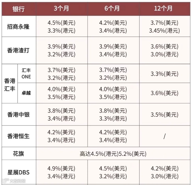 当然啦,利率也是咱们要考虑的因素之一,目前香港各家银行的美元定存利率都在调整,但是,香港银行的利率普遍比内地高,是不是很心动?