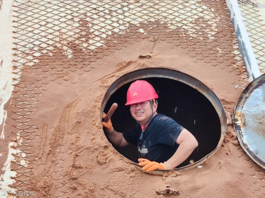 进行到第五层压裂,突然下起暴雨。所有人衣服都淋透了,鞋子里也灌满了水,但都坚守在各自岗位上。石英砂被雨水淋湿结块,会影响输砂速率。现场作业人员毫不犹豫地钻进砂罐内部,用铁锹将结块的支撑剂铲开,确保输砂连续性。