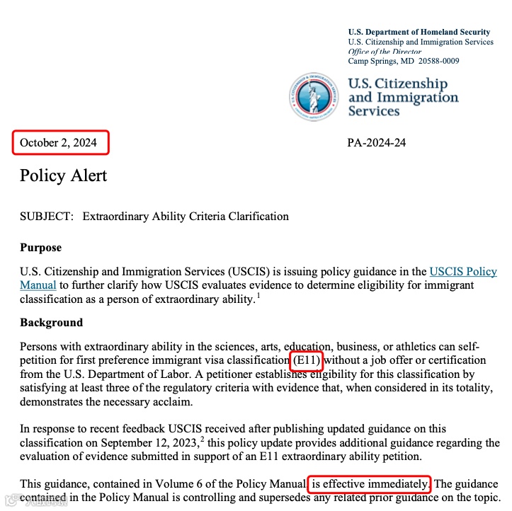 10月2日,美国公民及移民服务局在官网上发布了关于EB-1类杰出能力(E11)移民签证分类的最新政策指南,该指南进一步明确了移民局在审核EB-1A移民申请资格时,对申请标准的判断。移民局并指出,该指南立即生效。