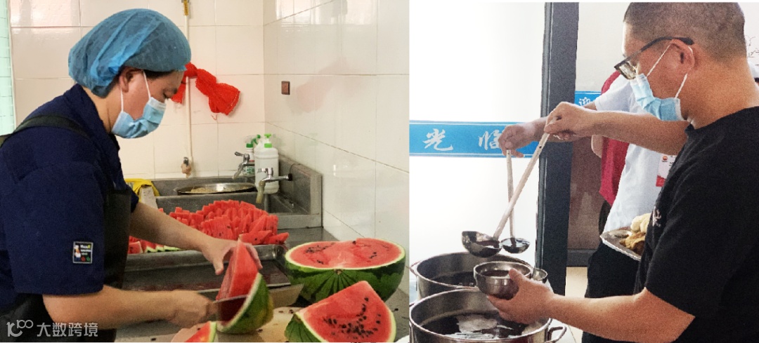 针对入秋后的持续高温天气,食堂合理调整食谱,每天午餐增加了蘸酱菜、凉拌菜、冰镇西瓜等,新鲜现煮的绿豆汤一直是必备;每天做好8样凉菜的调配,想方设法为就餐人员提供一份清凉。