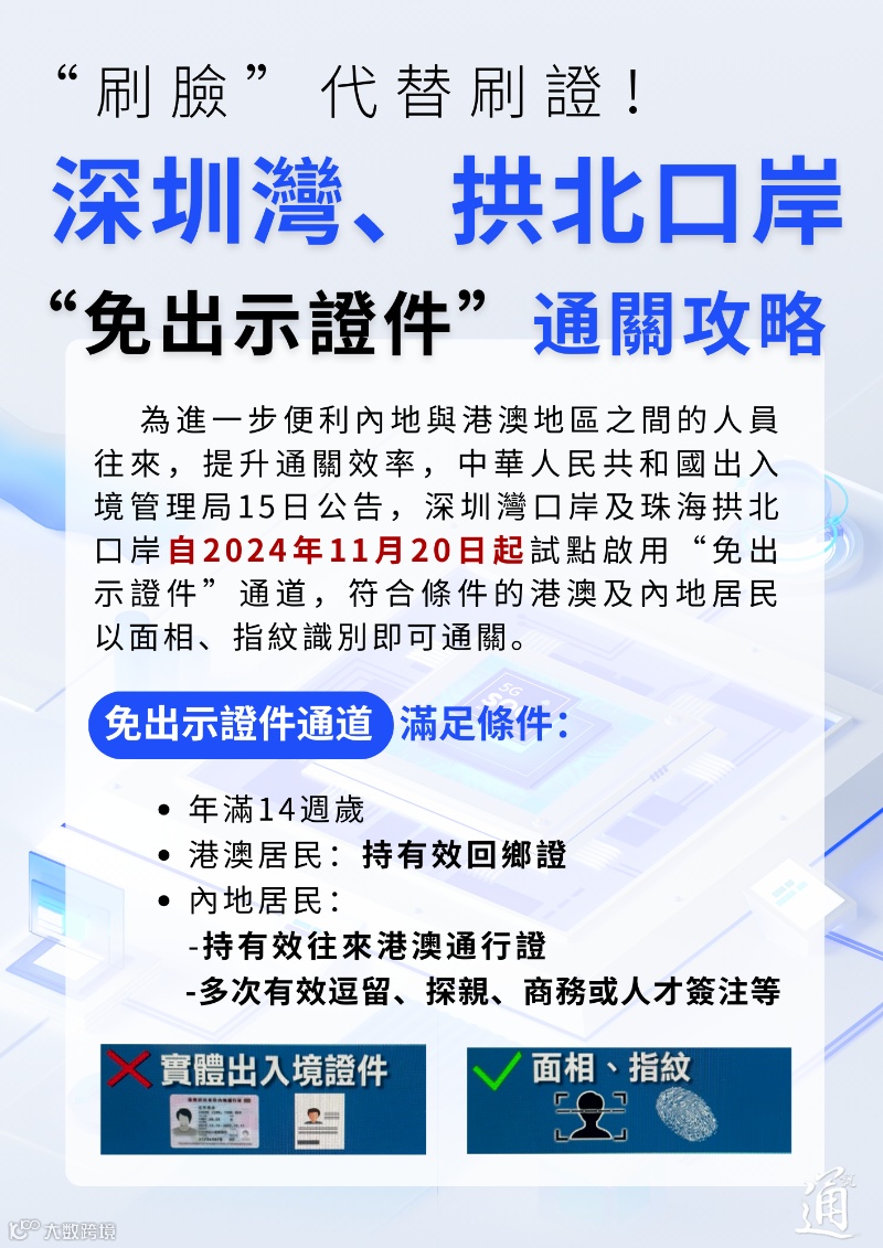 从2024年11月20日起,深圳湾口岸和珠海市拱北口岸将成为首批试点“免出示证件”通道的口岸。这意味着,符合条件的旅客在这两个口岸过关时,将无需再出示任何证件,只需通过面部识别技术即可完成通关流程。