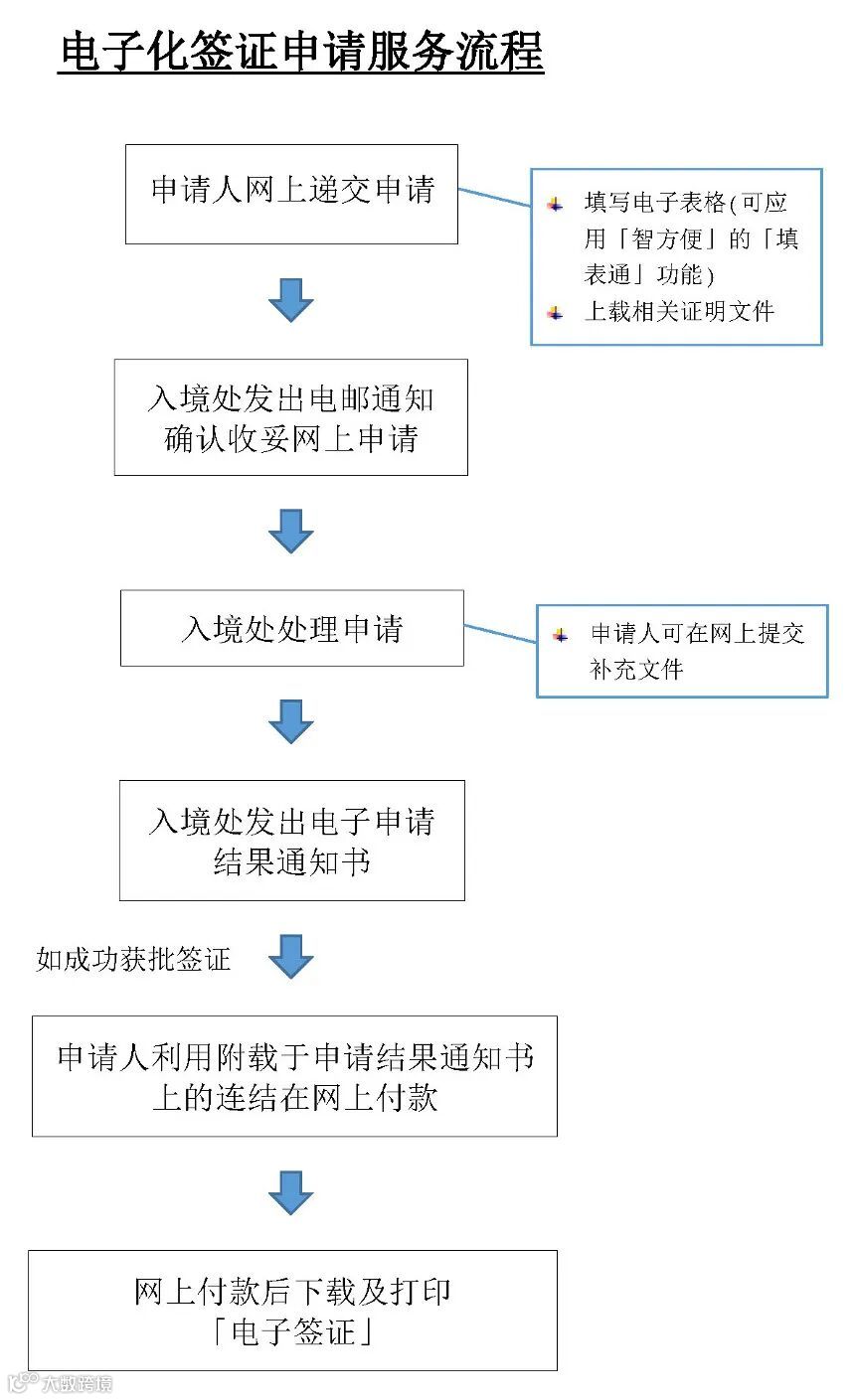 申请人只需通过入境处的“入境处流动应用程式”、入境处网页或香港政府一站通网页,即可完成从递交申请、缴费到领取“电子签证”的整个申请程序,全程无需亲身前往入境处办事处。