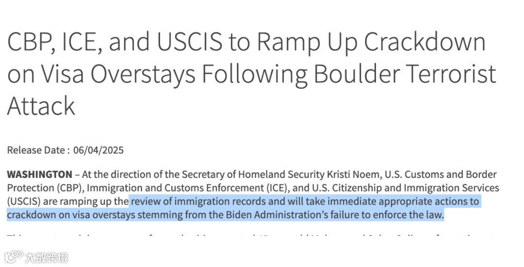 与此同时,美国公民及移民服务局(USCIS)发布新闻稿称,国土安全部(DHS)已下令美国海关与边境保护局(CBP)、移民与海关执法局(ICE)以及USCIS的工作人员重点打击签证逾期居留行为。