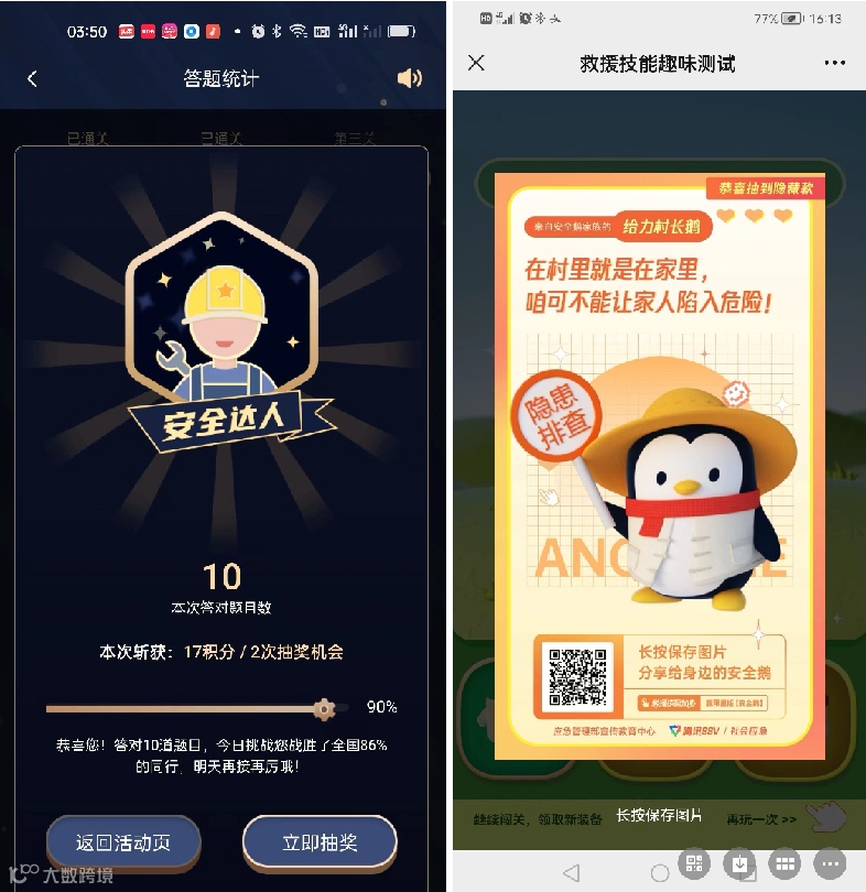 竞赛谱 “恭喜你,答对10道题。今天的挑战你战胜了全国86%的同行!”员工们积极参加链工宝APP中“新安全法知多少”竞赛答题活动,并开展“送安全到基层”和“晒晒我的安全鹅”活动,营造出争当超级应急“鹅”和安全班组的向上氛围。