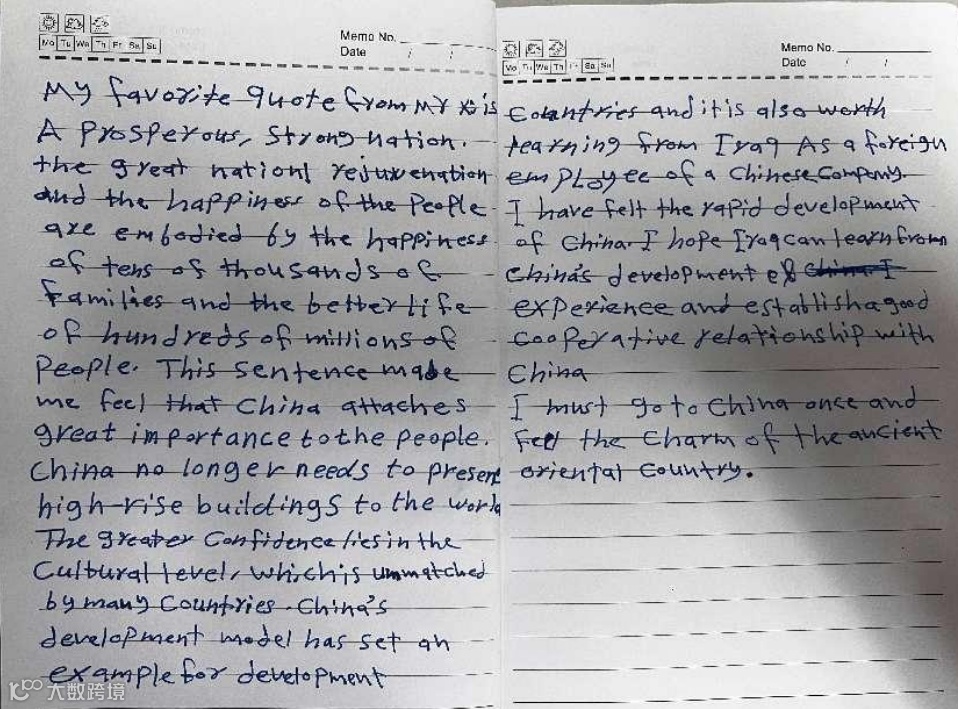 雇员Ahmed就是其中之一。他一有空就喜欢找中方员工聊天学汉语,还记下了不少心得体会。现在,他不光会说中文,还表达了一个美好的愿望:“我一定要去一次中国,东方古国的文化真是有魅力。”
