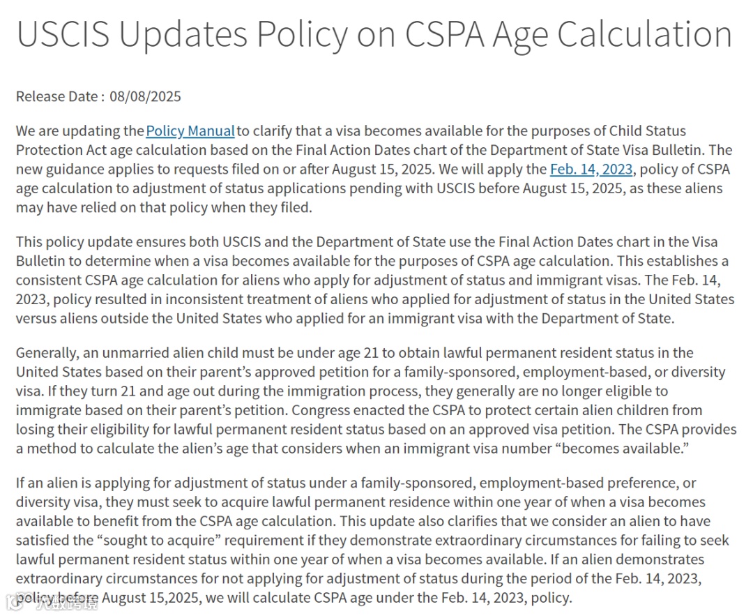 2025年8月8日,美国公民及移民服务局(USCIS)突然发布公告,宣布自2025年8月15日起,将全面改变《儿童身份保护法》(Child Status Protection Act,简称 CSPA)的年龄计算方式。这一变化将统一采用国务院签证公告中的“最终裁定日期表”(Final Action Dates,即表A)来计算CSPA年龄,不再参考“递交申请日期表”(Dates for Filing,即表B)。
