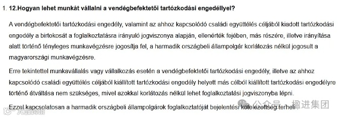 持有访客投资者居留许可及其为家庭同居目的而签发的相关居留许可的第三国国民,有权在匈牙利不受限制地工作。持证人可以根据其法律雇佣关系为他人工作或在他人的指导下工作,以换取报酬。