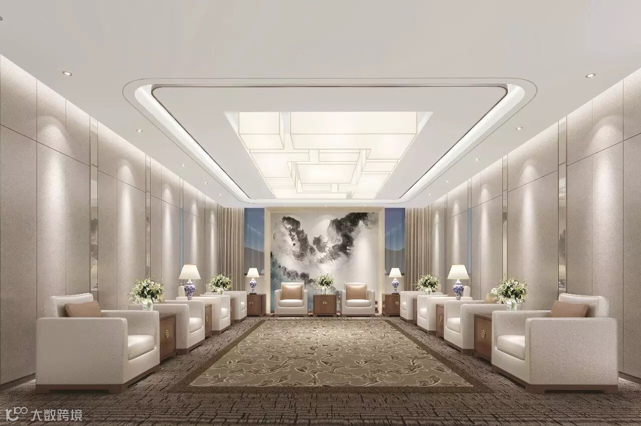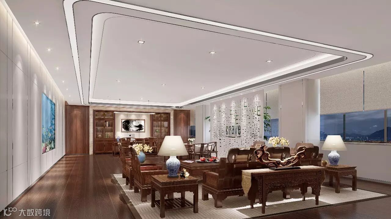 董事长室在现代的基础上同时溶入中式文化,通过墙面的块状分割结合LOGO图案镂空屏风及中式家具,将现代元素和中式元素和谐相溶,以灯光和材质来突出空间的层次感,营造出现代感空间氛围的同时又传承了中式文化,表达出企业文化的人文情怀。