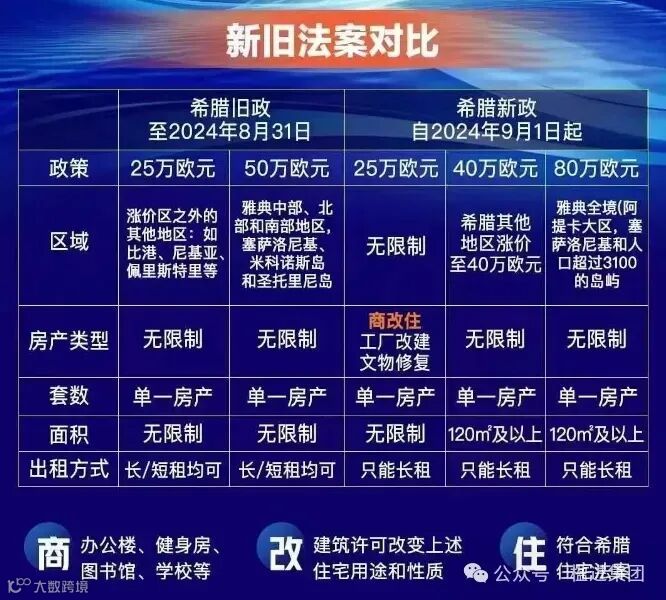 投资者现在必须在如阿提卡、塞萨洛尼基和一些人口超过3,100人的热门岛屿等优质地区投资80万欧元。不过,新政仍然保留了两个25万欧元的房地产投资选项:一是将商业地产改造为住宅用途;二是修复被列入保护名单的历史建筑。