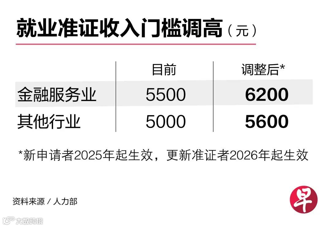 从明年1月起,新的就业准证持有者的最低月薪将调高600元,达到5600元,而金融服务业的新就业准证持有者的月薪门槛则调高到6200元。这意味着新的外籍员工将需要达到更高的薪资水平才能获得新的就业准证。