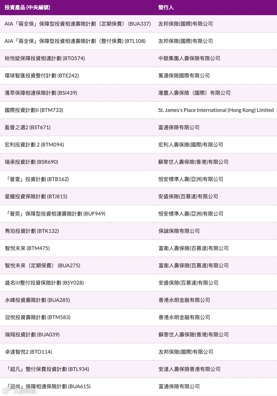 香港证监会在官网公布了合资格集体投资计划的列表,目前合资格的投连险产品如下,名单将会持续更新: