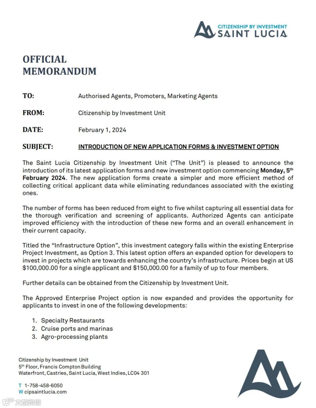 2月5日开始,圣卢西亚推出最新的申请表格和新的投资选择。新推出的基础建设项目,这个类似于之前的圣基茨新基建项目,核心就是比传统的捐赠项目便宜而且不需要融资。新的申请表数量也从之前的八份减少到五份,同时收集所有必要的数据,以便彻底核实和筛选申请人,随着这些新表格的引入,审理效率及速度会有显著提高。