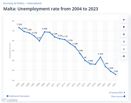 随着马耳他经济持续稳定的增长,当地的就业市场不断升温,失业率连年走低。2023年,马耳他失业率更是创新低,仅为2.6%,远低于欧盟6%的平均失业率,被认为是欧盟就业前景最好的地区之一。