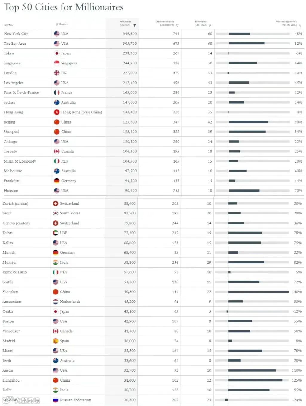 报告提到,中国有7个城市上榜,其中北京的百万富翁达到125600人,位列第10,百万富翁人数在2013年至2023年间增加了90%;上海百万富翁有123400人,同期增加84%,位列11。