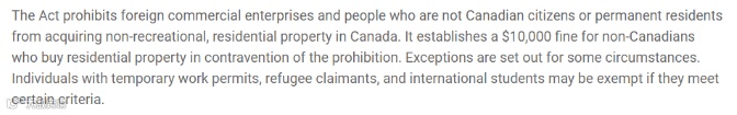 根据外国人买房禁令,外国商业企业、非加拿大公民或非永久居民,被禁止购买加拿大的非休闲住宅物业。对违反禁令购买住宅物业的海外买家,该法案设定了1万加元的罚款。