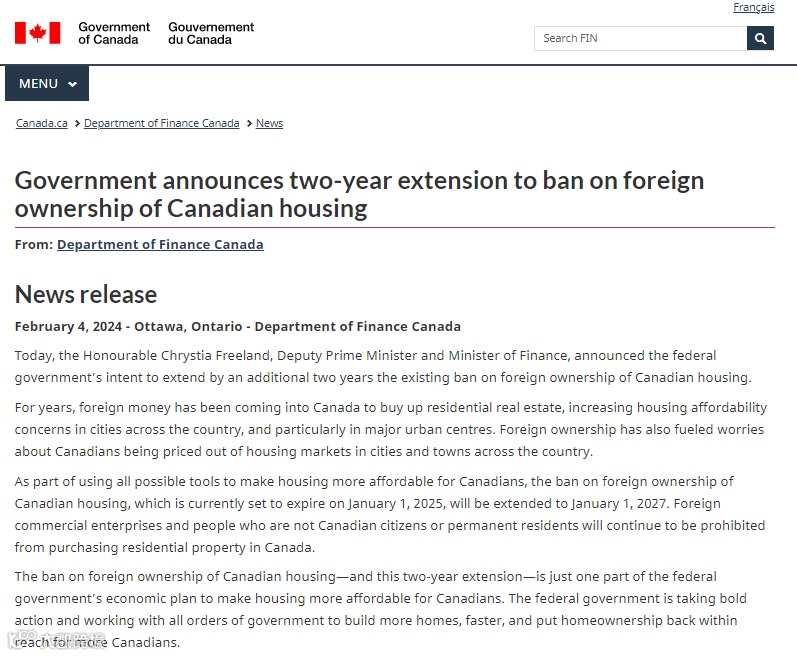 刚刚,加拿大副总理兼财政部长方慧兰(Chrystia Freeland)在一份新闻稿中宣布,联邦政府将延长外国人在加拿大购房的禁令。该规定于2022年首次公布,现在将延长至2027年初。