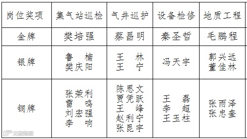 11月25日,公司油气风险作业市场基层岗位员工大练兵活动圆满结束。来自苏里格气田分公司的樊培强、蔡昌明、秦圣哲、毛鹏程和来自四川页岩气项目部的李成、徐放、李庆海、王福林、王霆获得相应专业金牌。