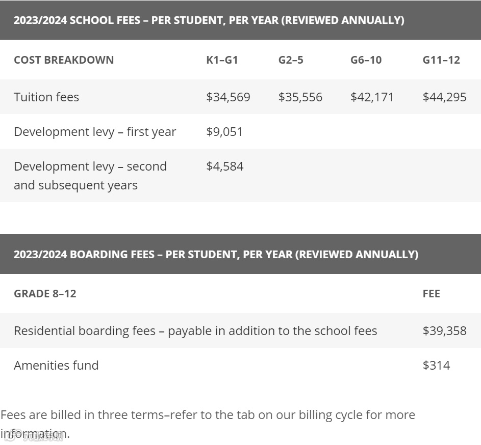 ※以上金额是目前整个学年的费用,每年会略有浮动。校外活动费、考试手续费、校服、午餐费等费用额外另计。
