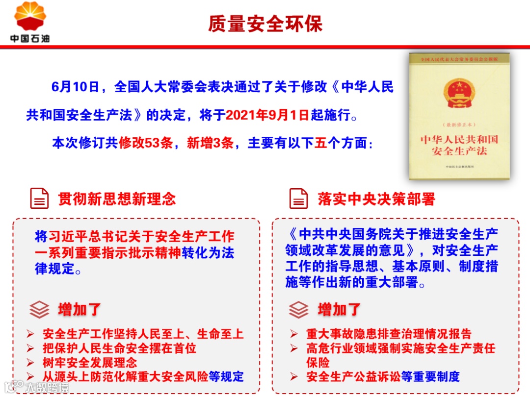 针对修订后安全生产法的主要变化,精心制作培训课件,组织全体员工分级开展专项培训。按照领导带头学、机关部门广泛学、基层单位深入学的原则,既要清楚国家、集团公司对于安全生产的新思想、新理念,持续完善全员安全生产责任制,更要弄懂自身在公司安全生产体系中的责任和工作标准,时刻应对新形势下的新问题、新风险,坚持“人民至上,生命至上”的基本原则,牢固树立安全发展理念。